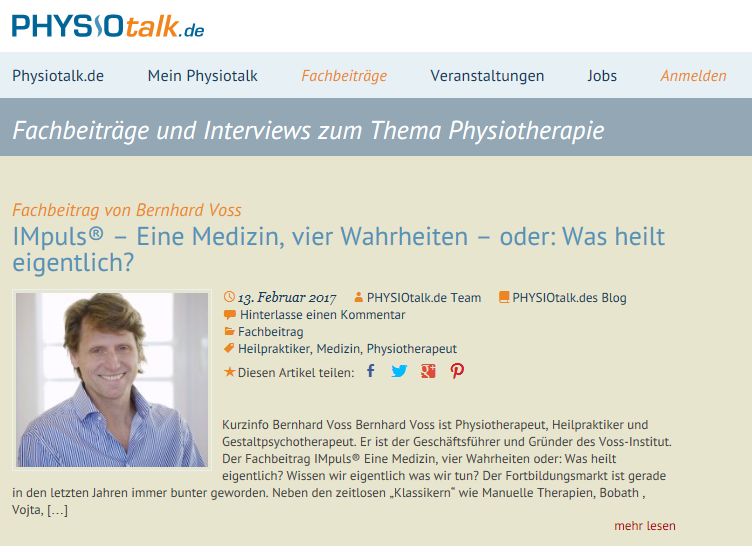 Bernhard Voss schreibt in dem Online-Fachmagazin physioTalk über das von ihm zusammen mit Jörg Petersen entwickelte 4-dimensionale Behandlungskonzept IMpuls® (Informationen zur Jahresausbildung hier)